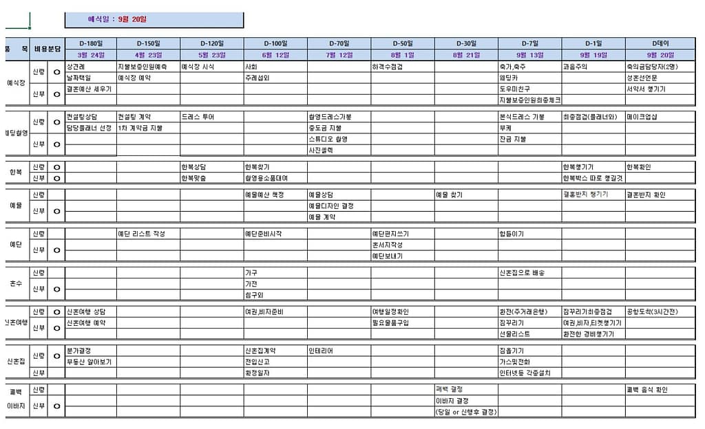 신랑도 약간 저와 같은 성격인데 핸드폰으로 보고 싶어 해서 폰에다가 메모를 하기도 하면서 이중으로 체크를 하다 보니까 중요한 일도 잊히지 않고, 동시에 여러 사람이 표를 보며 준비를 하니 그것만큼 도움이 되는 게 또 없더라고요.