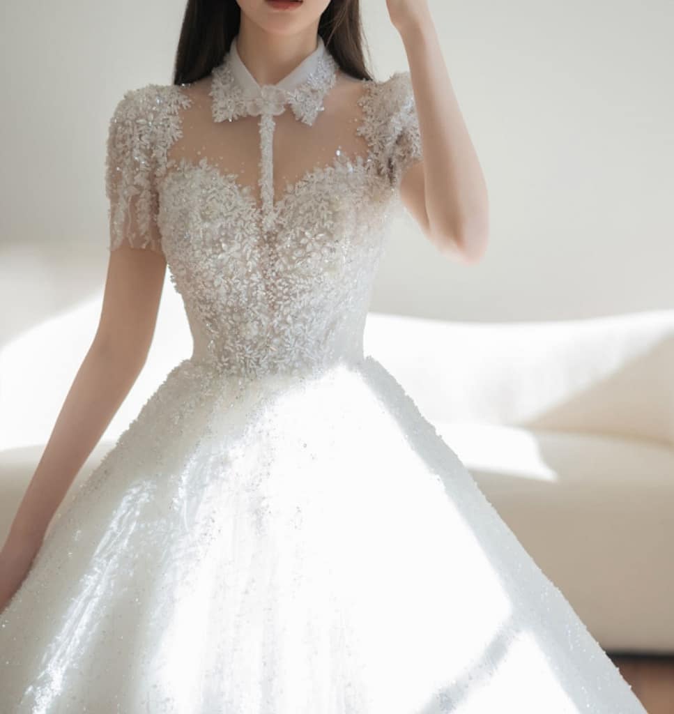 부드러운 툴 소재의 A라인 드레스는 하트탑으로 디자인되어서 여리여리 어려 보이는 효과도 있는 어떤 컷에도 잘 어울리는 드레스를 잘 표현한 게 아닐까 싶어요.