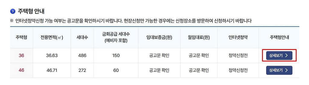 공고문을 다 확인했다면 신청 단계입니다. 원하는 주택형 선택하고, 유의사항 확인 후 다음 단계로 넘어가요.